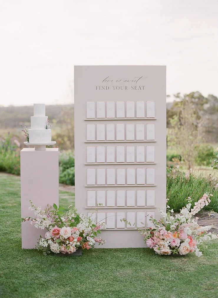 Talented Ella designed this beautiful seating backdrop finished with delicious, personalised chocolate bars for each of the guests. Her company Papelle produces the wraps for the chocolate bars in addition to beautiful stationary which can be shipped worldwide. The simple but delicious classic wedding cake was designed by De La Rosa Cakes in Perth.