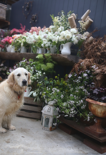 Abbey of Abbeylou Flowers and I hosted an afternoon at the farm on Saturday 29th September for a delightful group of ladies interested in learning a thing or two about how to arrange flowers for their home. Maisy our rather lovely Goldie was on hand to meet and greet our visitors. Always happy to accept any pats on offer!