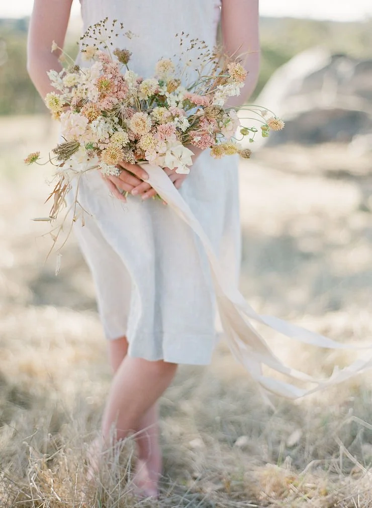 A bouquet of delicate fresh flowers #seasonalflowers and dried textural elements was finished with simple silk ribbons floating in the warm summer breeze, captured on film…a moment in time.